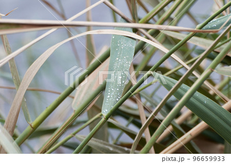 Lattice of reeds with a leaf with water droplets