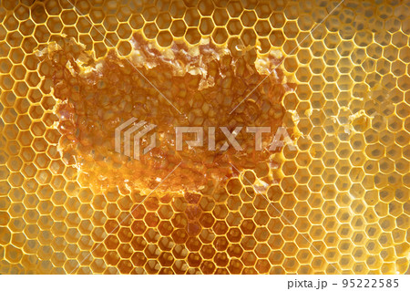 Honeycomb detail with the hexagonal shapes of its cells.
