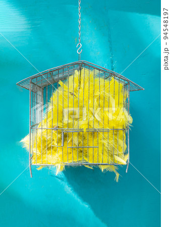 Bird cage filled with yellow feathers on a blue wall.