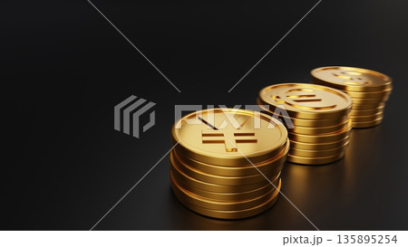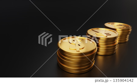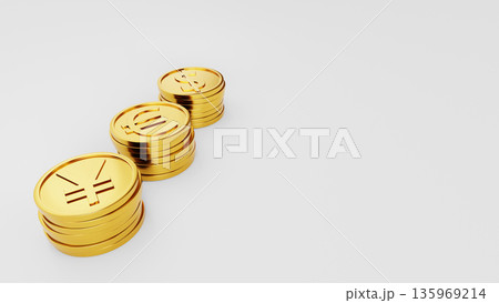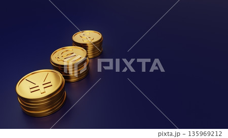 世界の主要通貨(ドル・円・ユーロ)の金貨3Dレンダリング 経済・金融イメージ