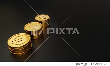 金色背景の金貨3種(ドル・円・ユーロ)と広いコピースペース 3DCG素材