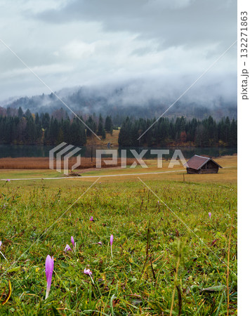 Autumnal flowers on meadow near alpine lake Geroldee or Wagenbruchsee, Bavaria, Germany