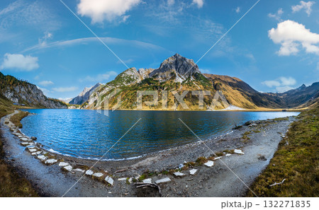 Autumn Alps mountain lake Wiestalstausee view, Salzkammergut, Upper Austria.