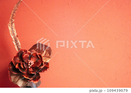 レンガの壁に飾った赤い花