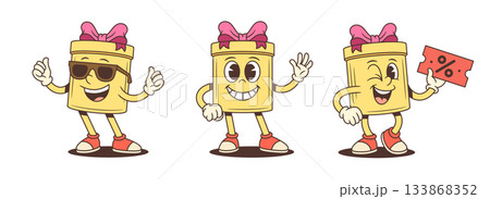 Three Cool Gift Box Cartoon Characters Waving And Holding Discount Vector Set