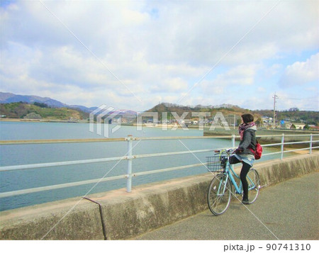 瀬戸内海の島からのぞむ女性と自転車
