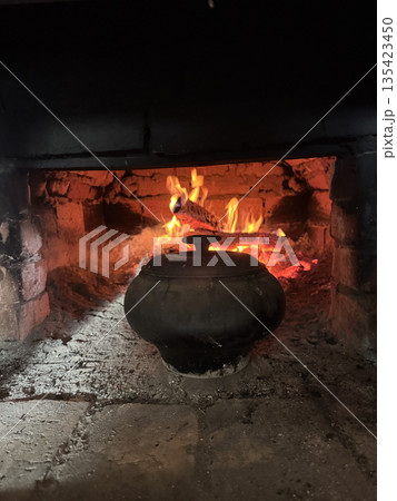 Cast iron covered with a lid. Stands on the hearth of a Russian stove. In the background, fire burns in the stove firebox. At the bottom, a woodpile with firewood is visible. Cooking food in a vintage