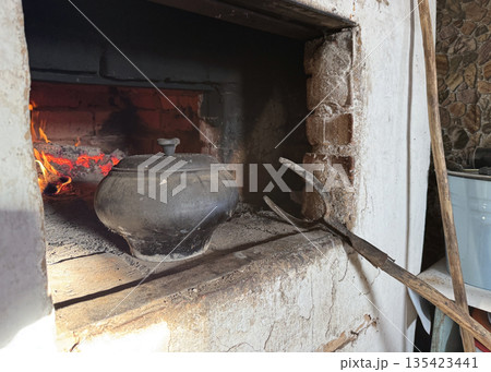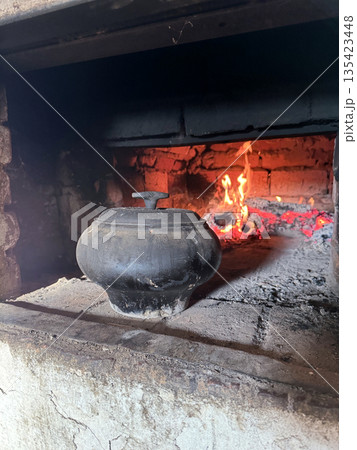 Cast iron covered with a lid. Stands in the stove firebox. Among coals and burning firewood. Cooking food in a Russian stove.