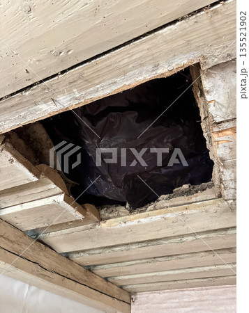 An opening in the ceiling of an old house. For a heating stove chimney.