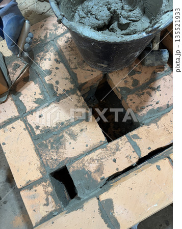 Smoke channels of a stove bench laid with brick. Stove construction. High-Angle Shot.