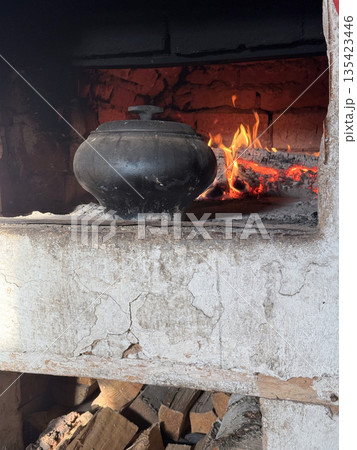 Cast iron covered with a lid. Stands on the hearth of a Russian stove. In the background, fire burns in the stove firebox. Cooking food in a vintage stove.