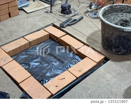 A stove base laid out of brick. A stack of bricks and tools nearby. Construction of a new heating stove.
