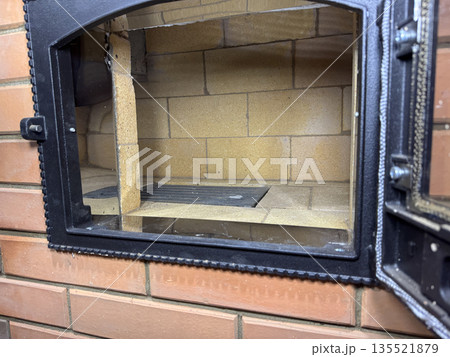 New heating stove. Brickwork, firebox and ash pit doors are visible. Stove construction.