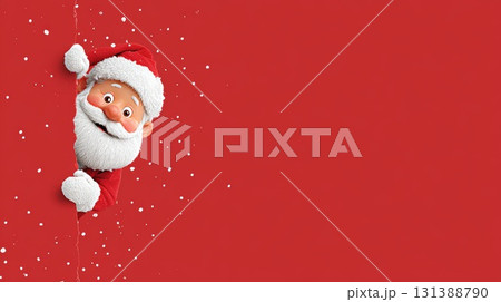 Cheerful Santa Claus character peeking from red background with snowflakes for festive design
