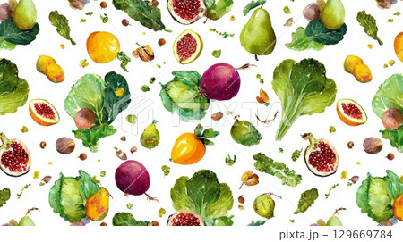 Vibrant watercolor illustration of assorted vegetables and fruits on a white background