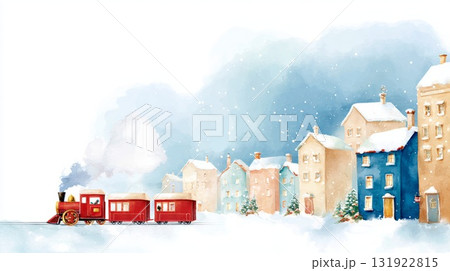Hand painted watercolor Christmas background with a train and snowy village scene