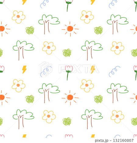 Doodle hand drawn. sun, tree and flower cartoon seamless pattern background