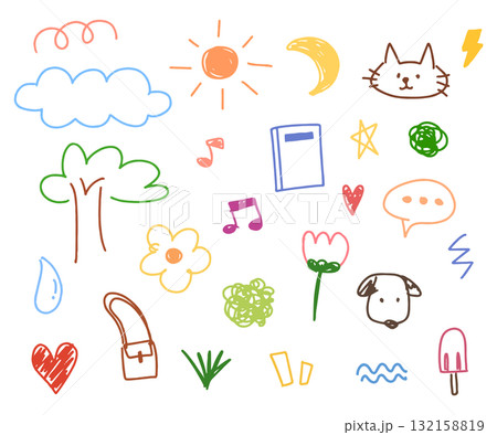 Doodle hand drawn. star, tree, heart, sun, note, cat, dog and music cartoon