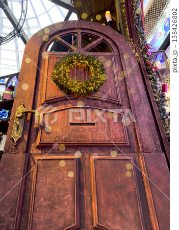 Festive Christmas wreath decorating a wooden front door of a residential house. Seasonal holiday