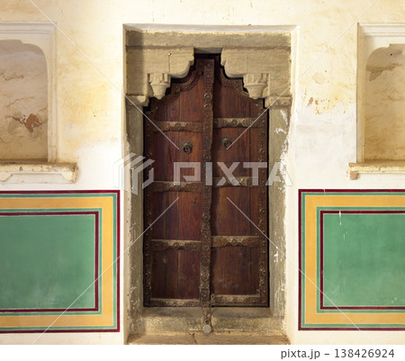 Traditional carved wooden door set within an old plastered wall decorated with colorful geometric
