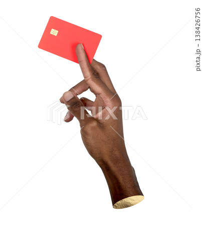 Close-up of a male hand holding a red credit or debit card, shown for cashless payment and shopping.