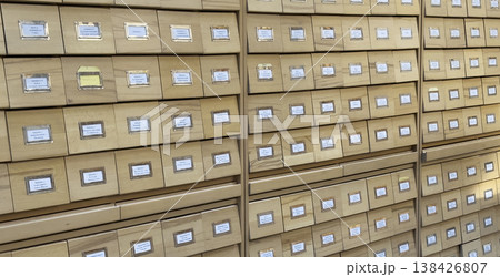 Antique wooden library card cabinet with labeled drawers and alphabetical index system. Vintage