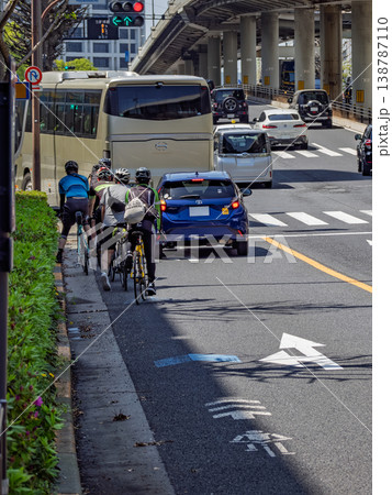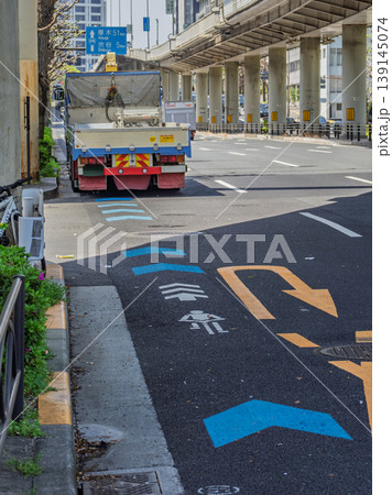 自転車ナビラインが描かれた都市道路と駐車車両 交通環境の現状