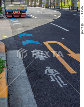 横断歩道手前に設置された自転車停止表示と交差点の安全対策