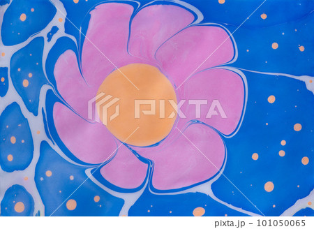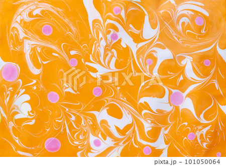 Abstract marbling ebru colorful orange background with waves and pink blots