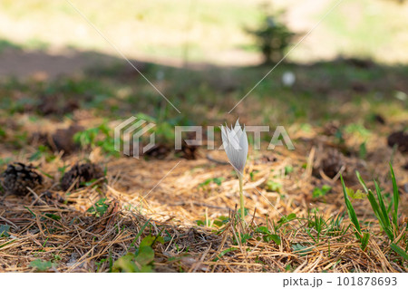 Autumnal crocus Colchicum autumnal in meadow in fir forest. delicate autumn flower. blurred background