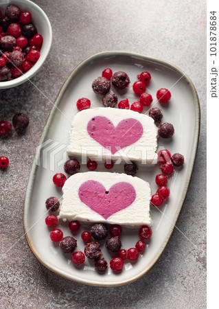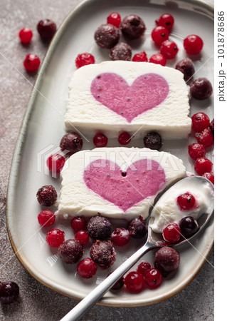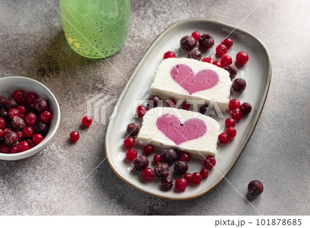 vanilla ice cream with berry heart filling in middle and chia seeds water in bottle. Summer food concept