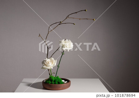 Flower arrangement of white carnation, rose and tree branches in ceramic vase with stones and moss. Japanese Ikebana style. gray background