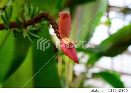 Close up of Musa manni flower with pink bracts and stamens in tropical India. Rare wild banana species showing botanical structure and exotic form.