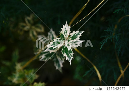 Variegated leaves of Osmanthus heterophyllus with spiny holly like shape green and white foliage shown in close up on dark natural background