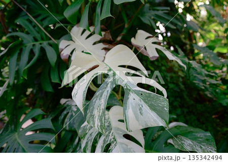 Variegated Monstera deliciosa with large split leaves showing white and green patterns in tropical garden foliage, exotic houseplant texture and nature detail