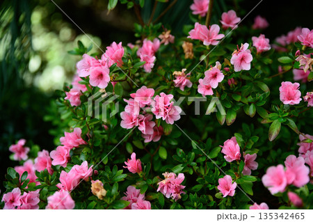 Pink flowers of Kirin azalea rhododendron blooming on a dense green shrub in a garden. Spring ornamental plant with soft petals in natural light.