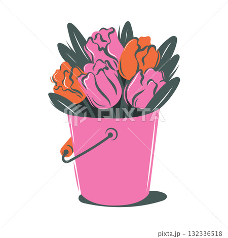 A bouquet of pink tulips in a bucket. Stylish modern flat illustration for a flower shop. Sticker