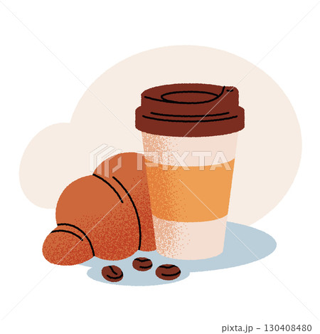 Sticker with a paper cup of coffee and a croissant. Breakfast in a cafe. Modern flat illustration. Illustration for web design and advertising.