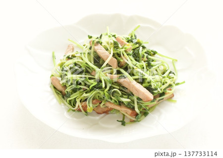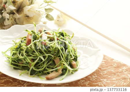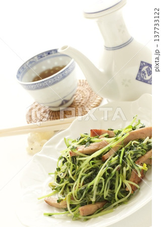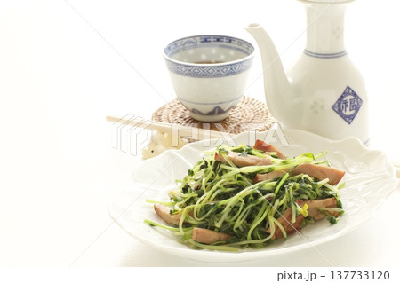 豆苗のベーコン炒めと中国茶
