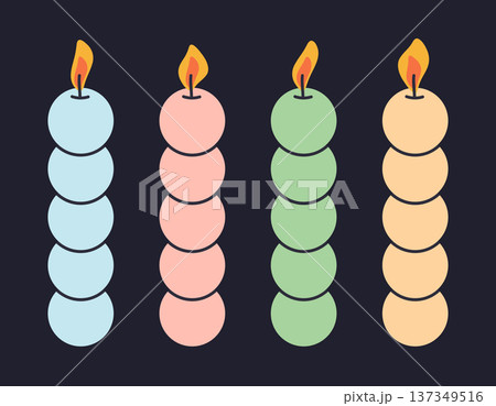 Cute bubble aroma candles. Burning aromatic wax candles, decorative home interior aromatherapy candles flat vector illustration set. Beige candles isolated on dark background