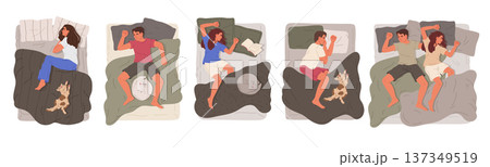 Cartoon sleeping people. Man and woman resting in bed with pets, napping characters and cute domestic animals flat vector illustration set. Male and female person sleeping in cozy beds