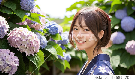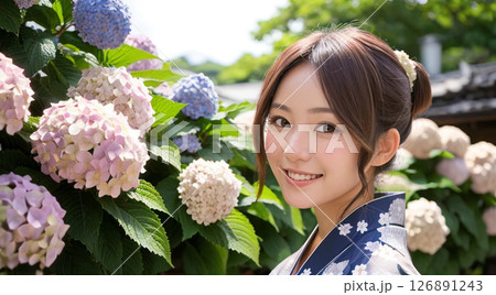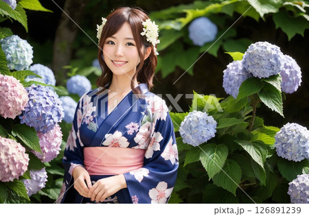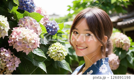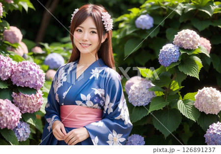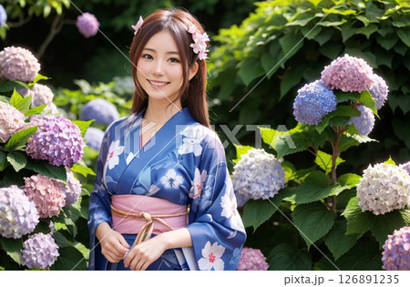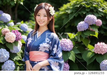 浴衣の女性 紫陽花の背景「AI生成画像」