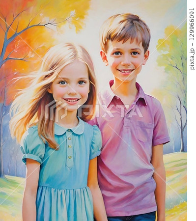 笑顔でポーズをとる仲良しのきょうだいのイラスト