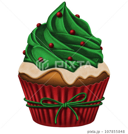Cute realistic christmas cupcake with red bow and glaze balls chocolate