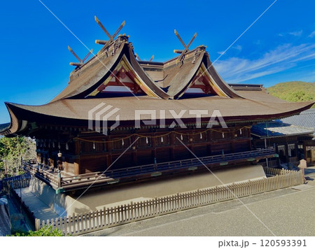 青空に映える吉備津神社の本殿
