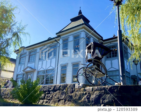 川面から見上げたレトロな洋風建築の建物と人力車