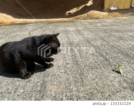 威嚇してくるカマキリを不思議そうに眺める猫