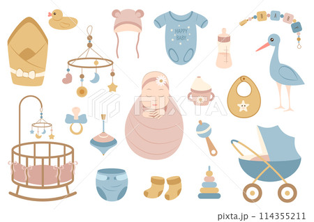 Cute baby set. Cradle, stroller, toys, pacifier. Collection of vector elements on white background for design of postcards, posters, stickers, stickers.