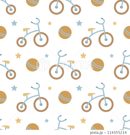 A simple seamless pattern in a flat style. Children's tricycle. For decorating children's room, textiles, wrapping paper, wallpaper. Vector.