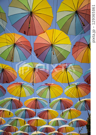 Many rainbow colored umbrellas against blue sky
